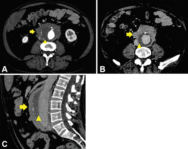 Se distingue del aneurisma ateroesclerótico por presentarse con engrosamiento de la pared, acompañado por fibrosis densa que puede llegar a envolver estructuras adyacentes, tales como el duodeno, el uréter y la vena cava inferior. Ocurren en la porción infrarrenal de la aorta abdominal y en pacientes más jóvenes que los afectados por la causa aterosclerótica.2,16