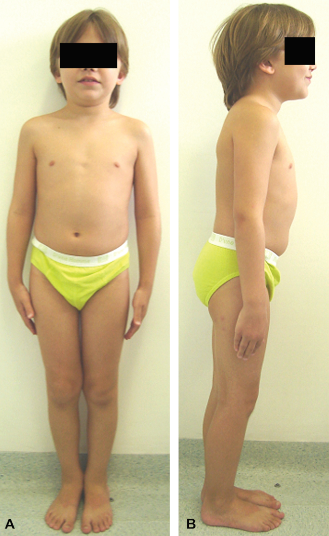 A los 8 años de edad, presentó fiebre recurrente de origen desconocido. En la evaluación clínica, a los 9 años de edad, el niño tenía un peso de 25,55 kg (DE -0,86), una talla de 120 cm (DE -2,4) y un perímetro cefálico de 53,5 cm (DE +0,72), pliegues epicánticos bilaterales, puente nasal bajo, narinas en anteroversión, orejas de implantación baja, leve desproporción entre los segmentos superior e inferior del cuerpo y hepatoesplenomegalia (►Fig. 1A y B).
