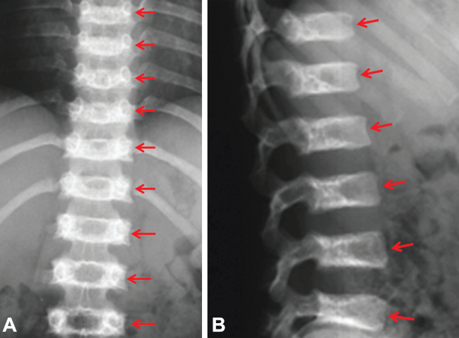 El examen radiológico de la columna verificó la presencia de vértebras con acentuada platiespondilia (importante reducción del diámetro vertical de las vértebras), hendiduras coronales y lesiones radiotransparentes (encondromas) que determinan irregularidad del platillo vertebral (►Fig. 2A y B).