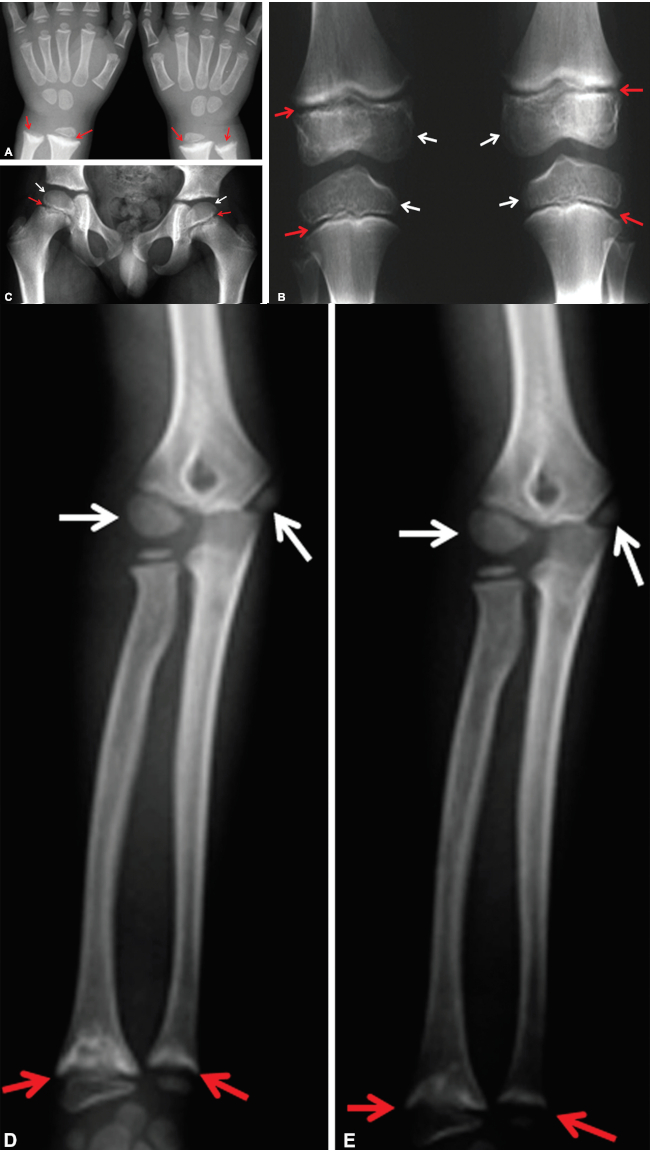 Los hallazgos radiológicos específicos observados en nuestro paciente, principalmente en las vértebras, la porción distal del radio y del cúbito y las rodillas, permitieron diagnosticar SPENCD.2,3 En una publicación, Schorr y col.4 plantearon el diagnóstico de SPENCD en base a los hallazgos óseos, que comprenden la presencia de platispondilia de grado variable, con irregularidad de los platillos vertebrales superior e inferior, presencia de lesiones nodulares localizadas inicialmente (o solo) en el tercio o la mitad posterior del cuerpo vertebral y lesiones no osificantes radiotransparentes, en sacabocados, redondeadas o multilobuladas que se extienden desde el cartílago de crecimiento a la metáfisis y diáfisis. Esas lesiones pueden ser de gravedad variable y aparecer solo en los huesos largos (típicamente en la zona distal de la rodilla, peroné proximal, radio distal y cúbito), pero también pueden observarse en otros sitios de crecimiento endocondral, como la cresta ilíaca.4,5
