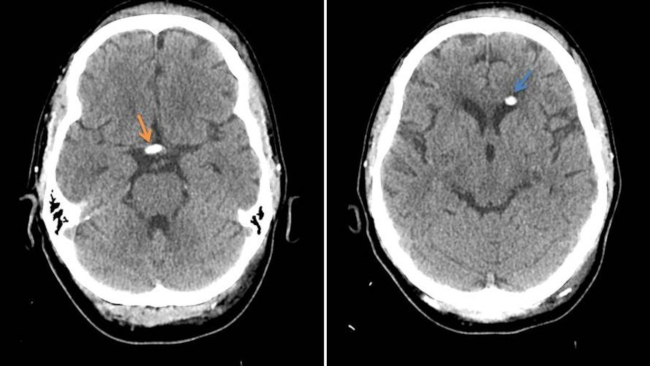 La TC muestra dos imágenes de morfología globular y alta densidad una en cisterna supraselar inmediatamente superior al quiasma óptico y otra en asta frontal del ventrículo lateral izquierdo (►Fig. 1), que plantean la posibilidad de tratarse de un sangrado. Si bien su disposición y morfología son anómalas, no se puede descartar que la primera se trate de un aneurisma de la bifurcación de la arteria carótida interna derecha.