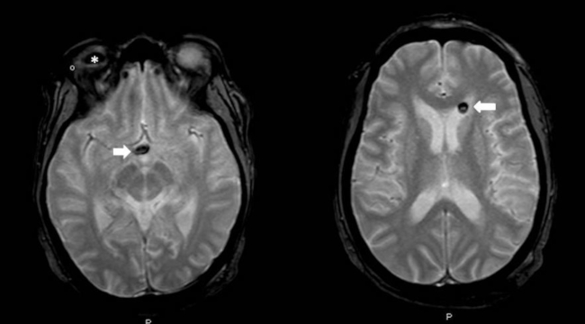 La paciente fue ingresada y se decidió completar estudio mediante resonancia magnética (RM). El estudio de RM muestra la persistencia de dichas imágenes que se visualizaban hipointensas en secuencias ponderadas en T2 (►Fig. 2).