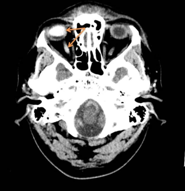 Revisando las imágenes de TC y RM, se observó que en el globo ocular derecho y nervio óptico (►Fig. 2 y ►Fig. 3) existía un material de la misma densidad/intensidad de señal que las imágenes visualizadas en región supraselar y ventrículo. Revisando la historia, se comprobó que la paciente había sido intervenida por un desprendimiento de retina años atrás, dato clave para concluir que dichos hallazgos se trataban de gotas de aceite de silicona que habían migrado al espacio subaracnoideo e intraventricular.
