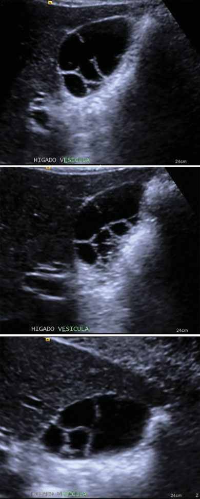 Los hallazgos clásicamente descritos no difieren de lo observado en nuestro caso: una vesícula única, de tamaño normal, contornos lobulados, septos internos finos y aspecto de panal de abeja.