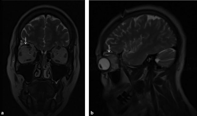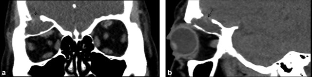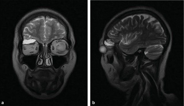 Se presenta el caso de una paciente femenina de 51 años, que es remitida a consulta de Oculoplastia por notar desde hace aproximadamente cuatro años una proptosis derecha no dolorosa y de progresión lenta, la cual apareció tras recibir un trauma contuso a este mismo nivel. Al examen físico, se corroboró la proptosis y se constató edema palpebral, por lo que se realizó tomografía computada (TC) simple, que reveló una lesión osteolítica en el techo de la órbita derecha, con densidades medias internas entre 12 y 30 Unidades Hounsfield, la cual expandía el hueso frontal comprometido, adelgazando y rompiendo parcialmente la tabla externa, mientras que en la interna se descubrió una solución de continuidad, de ± 8mm en sentido latero-lateral. Dicha imagen ocupante de espacio ocasionaba desplazamiento antero-inferior del globo ocular, e inferior del complejo muscular recto superior-elevador del párpado superior y del complejo nervio óptico-vaina. Además, se comprobó independiente del seno frontal, llegando a medir ± 29 × 24 × 13mm en sentido rostro-caudal, latero-lateral y dorso-ventral respectivamente (►Fig. 1). Seguidamente, se hizo una resonancia magnética (RM) donde la lesión del techo orbitario se comportó prácticamente isointensa, con respecto al LCR, tanto en las secuencias potenciadas en T1 como en las ponderadas en T2; y se confirmó el resto de los hallazgos tomográficos previamente descritos (►Fig. 2). Posteriormente, se efectuó un scan radiográfico óseo sin demostrarse lesiones osteolíticas adicionales, así como ultrasonido de cuello, mamas y abdomen, y radiografía de tórax, sin evidenciarse una posible lesión primaria. Teniendo en cuenta lo expuesto, se planteó el diagnóstico de fractura orbitaria evolutiva, con herniación de meninges y de pequeña porción encefálica, asociado a extensión intradiploica del componente quístico. La paciente se sometió a neurocirugía y se le realizó reparación quirúrgica del defecto dural, mediante el empleo de material autólogo (fascia lata), lográndose una evolución satisfactoria con remisión de la proptosis (►Fig. 3).