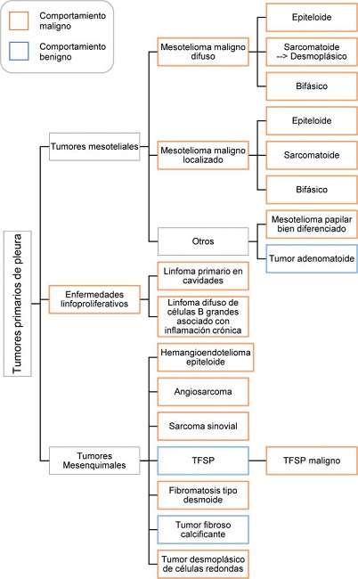 Las neoplasias originadas en la pleura pueden ser primarias o secundarias. Las lesiones primarias son poco frecuentes, representan menos del 5% de los tumores de la pleura y se clasifican de acuerdo a su naturaleza (benignas o malignas) y a su origen (mesotelial, mesenquimal o linfoproliferativo) (►Gráfico 1).5,6