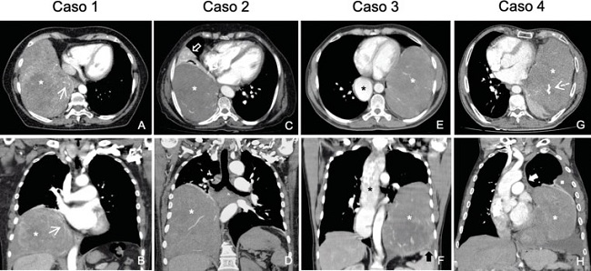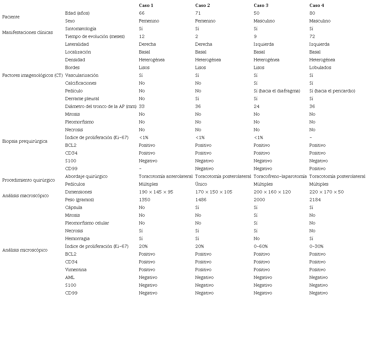 Resultados.: Todos los pacientes de la serie cursaron con manifestaciones clínicas, con un promedio de 23,75 meses de evolución. El 50% de los tumores se localizaron en la cavidad pleural derecha y el 50% en la izquierda. En tomografía computarizada (TC) de tórax, los cuatro casos se presentaron como una masa sólida, de densidad heterogénea, con diámetros mayores entre 17 y 22 cm y contornos variables (lisos en tres casos y lobulados en un paciente). Se observaron calcificaciones intratumorales en dos casos y derrame pleural en tres pacientes. En cirugía, todas las masas presentaron pedículos. El análisis histológico e inmuno-químico confirmó la naturaleza benigna de tres casos y malignidad en una de las neoplasias.