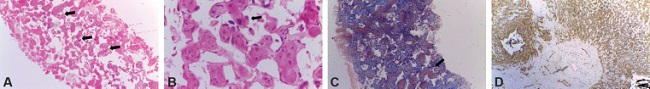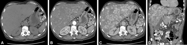 Comunicamos el caso de un paciente masculino de 77 años, con antecedente de hipertensión arterial, diabetes mellitus tipo 2, tabaquismo activo y alcoholismo crónico, quien consultó por cuadro clínico de un mes de evolución de ictericia asociada a dolor abdominal difuso y pérdida de peso. Además, en los últimos días con coluria, melenas y hematemesis. En los exámenes paraclínicos se identificó anemia microcítica y trombocitopenia. Inicialmente, le realizaron una ecografía, que demostró múltiples lesiones hepáticas sugestivas de metástasis, por lo cual fue trasladado a nuestra institución, donde se realizaron endoscopia digestiva superior sin hallazgos patológicos y tomografía compuratizada (TC) de abdomen que demostró múltiples lesiones hipervasculares hepáticas (►Fig. 1). Teniendo en cuenta la clínica y los hallazgos hepáticos, se realizó una biopsia percutánea, cuya patología diagnosticó AH (►Figs. 2 y 3).