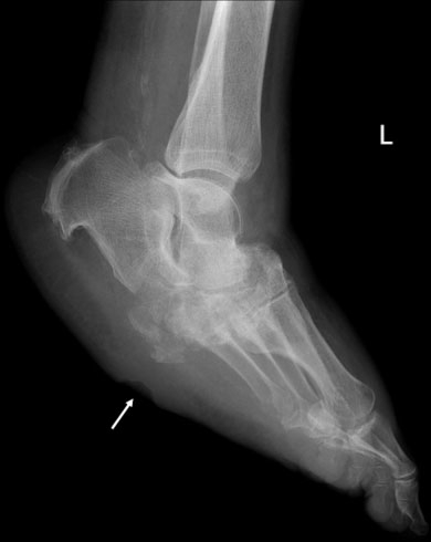 Debido a que el hueso cuboides se convierte en el más inferior del pie, este es más propenso a la formación de hiperqueratosis, ampollas y úlceras extensas, especialmente a este nivel. Ello puede conducir a infecciones de tejidos blandos y osteomielitis. En esos casos, resulta útil la aplicación de medio de contraste, indicación controversial en otros casos, por el riesgo intrínseco de insuficiencia renal que ese tipo de pacientes posee.3