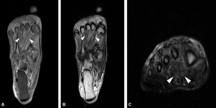 La denervación muscular corresponde a uno de los hallazgos más frecuentemente observados en esa patología. Tiene una etiología multifactorial, con la neuropatía periférica como una de sus principales causas. La denervación muscular subaguda se caracteriza por hiperintensidad de señal en secuencias ponderadas en T2, con mantención de su morfología e intensidad de señal en secuencias ponderadas en T1. En la fase crónica, se evidencia infiltración grasa, que es más visible en secuencias ponderadas en T1. Se puede observar predominantemente en la musculatura intrínseca del pie (►Fig. 2).3,9