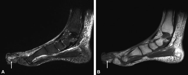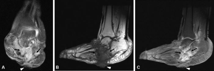 Cuando se necesita un estudio avanzado, la RM es el examen de elección. En un meta-análisis, su sensibilidad para diagnosticar osteomielitis en el pie diabético fue del 90%, mientras que la especificidad fue del 79%. La principal ventaja de RM es su capacidad para identificar la extensión del área afectada. La forma más fácil de detectar la osteomielitis es seguir el camino de la úlcera de la piel o el tracto sinusal hacia el hueso y evaluar la intensidad de la señal ósea. De esa manera, se pueden distinguir úlceras en la piel, trayectos fistulosos, abscesos adyacentes al hueso afectado, sinovitis, disrupción de la cortical, periostitis y característicamente alteraciones de señal de la médula ósea, con baja señal en secuencias ponderadas en T1, aumento de señal en secuencias ponderadas en T2 y STIR y realce con gadolinio (►Fig. 9).16