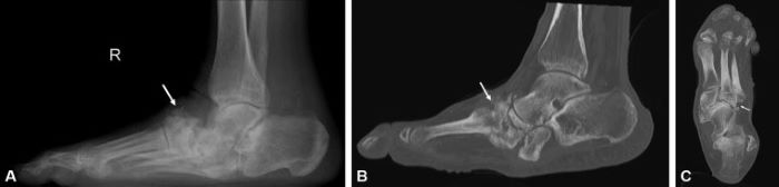 En la fase activa, el hueso se vuelve frágil debido a una osteopenia temporal, lo que conduce a fracturas, destrucción articular y colapso del arco longitudinal del pie. Durante la fase inactiva aparecen osteofitos prominentes y cuerpos libres, como consecuencia de una destrucción sustancial articular y ósea, seguida de proliferaciones óseas. La apariencia típica de la etapa final de un pie de Charcot es la deformidad “en mecedora.”3,12,13