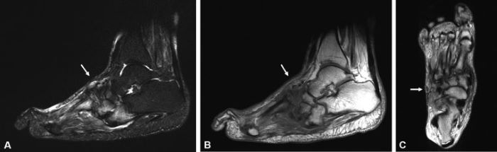 Se presenta predominantemente en el mediopié y compromete al conjunto de estructuras óseas y partes blandas adyacentes, no limitándose a un solo hueso. Se visualiza en RM como áreas de alta señal en secuencias ponderadas en T2 y STIR, con leve realce tras la administración de contraste en secuencia ponderada T1 fat-sat, de predominio subcondral en etapas iniciales. (►Fig. 4).1,4,5,10