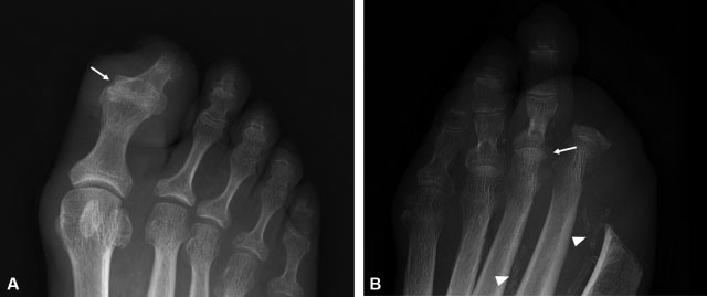 Los clásicos hallazgos radiográficos en la neuroartropatía de Charcot se resumen en cinco conceptos (en inglés “the five D’s”), que corresponden a densidad ósea anormal, derrame articular, fragmentación ósea, desorganización articular y luxaciones, siendo la más frecuente la tarso-metatarsiana (articulación de Lisfranc) (►Fig. 5).14