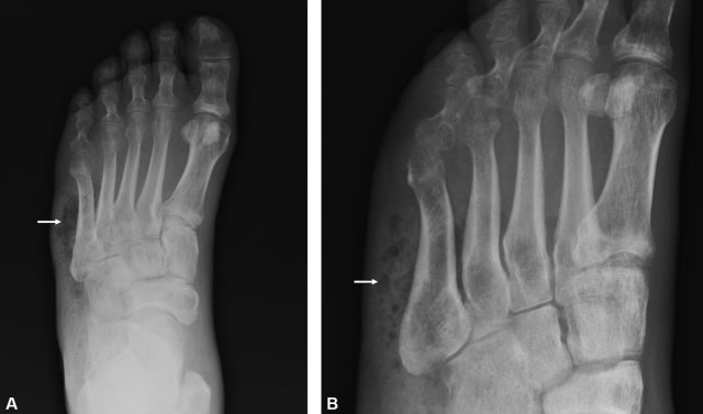Ocurre predominantemente en las arterias distales de extremidades inferiores que incluyen arterias tibiales anteriores y posteriores, peroneas distales, pedias y arcos plantares, visualizándose en todas las modalidades de imágenes como calcificaciones lineales en sus trayectos (►Fig. 3). Eso puede determinar áreas de isquemia que pueden llevar a la desvitalización del tejido, observándose en TC y RM como áreas focales de tejidos blandos que no realzan tras la administración de medio de contraste, con un límite bien definido con el tejido adyacente que realza con el contraste intravenoso. Ante esos hallazgos, se debe considerar también la posibilidad de absceso, valiéndose de elementos como la presencia de burbujas de aire para su diferenciación. La isquemia crónica también puede dar lugar a infartos óseos, que se reconocen en RM como alteraciones de señal intramedulares de contornos serpiginosos relativamente bien definidos que se rodean de un halo hipointenso en secuencias ponderadas en T1 e hiperintenso en secuencias ponderadas en T2.1,3,5,6