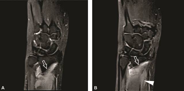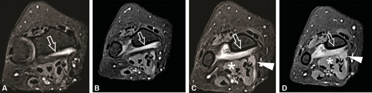 Se realizó RM de muñeca en equipo de 1,5 Tesla con bobina Flex small de 4 canales, secuencias ponderadas en T1 y DP-FATSAT axial y coronal y DP-FATSAT sagital, evidenciándose hiperintensidad en DP-FATSAT de los músculos PC, FLP y, en menor medida, FPDim, compatible con patrón denervatorio por compromiso del NIA (►Figs. 1 y 2).