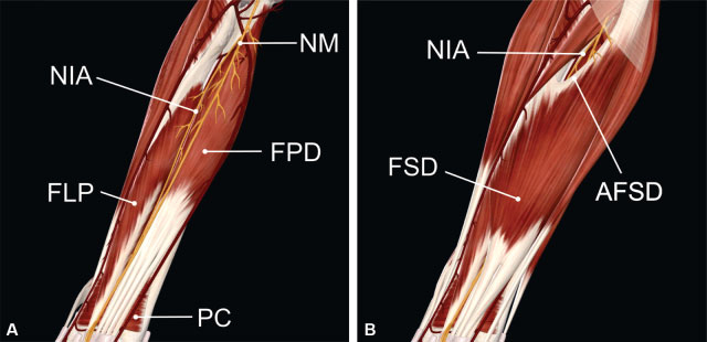 El NIA nace del nervio mediano a 4-6 cm de la interlínea epicondílea humeral, a la altura de la unión de las dos cabezas del pronador redondo o cercano a la arcada del músculo flexor superficial (FSD). Se dirige distalmente sobre a la cara anterior de la membrana interósea del antebrazo donde da ramos para FLP y FPDim, termina en el PC, al que inerva en forma constante, finalmente da ramos para las articulaciones radiocubital distal, radiocarpiana y carpiana (►Figura 3). Pueden existir ramos comunicantes entre el NIA, mediano y nervio cubital ocasionando discretas variaciones en el patrón inervatorio. Esos son inconstantes y variables.3 En nuestro caso, la escasa afectación del FPDim podría vincularse a esa contingencia.