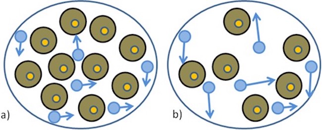 La imagen ponderada en difusión (DWI, diffusion-weighted imaging) es una técnica funcional que aporta información complementaria a las secuencias convencionales de RM. La DWI añade información acerca del movimiento browniano aleatorio de las moléculas de agua libre en el espacio intersticial y a través de la membrana celular. Este movimiento se ve afectado por el entorno local del tejido y la presencia de barreras (por ejemplo, las membranas celulares y las membranas semipermeables). El movimiento de las moléculas de agua está más restringido en los tejidos con una alta densidad celular (por ejemplo, el tejido tumoral) que en las zonas de baja celularidad, ya que ofrecen un espacio extracelular más grande, o donde las membranas celulares han sido destruidas. Por lo tanto, el grado de difusión de agua en los tejidos es inversamente proporcional a la celularidad de este y a la integridad de las membranas celulares. Las imágenes por DWI se utilizan para visualizar el grado de difusión de las moléculas de agua in vivo, y la intensidad de la señal es inversamente proporcional al grado de difusión de las moléculas de agua, que estará influenciado por la estructura histológica (Fig. 1) (6,7.