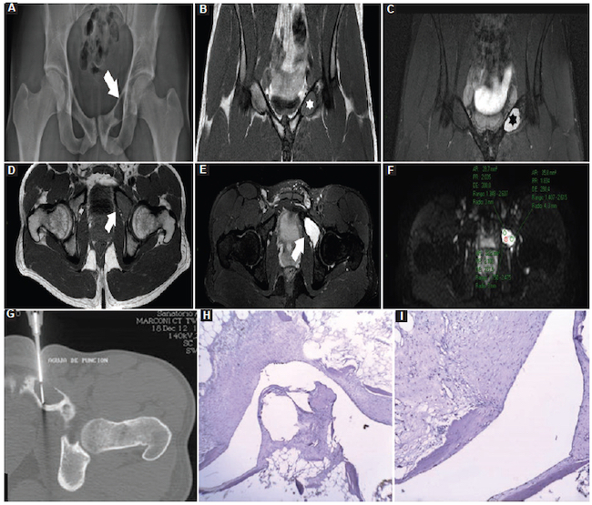 Las lesiones pseudotumorales infecciosas, osteomielitis o abscesos, mostraron una difusión restringida, con un valor de CDA bajo. Esto fue explicado por Wong et al. (21, quienes afirmaron que el material purulento, las células inflamatorias y el tejido de granulación entorpecen el movimiento normal de las moléculas de agua.