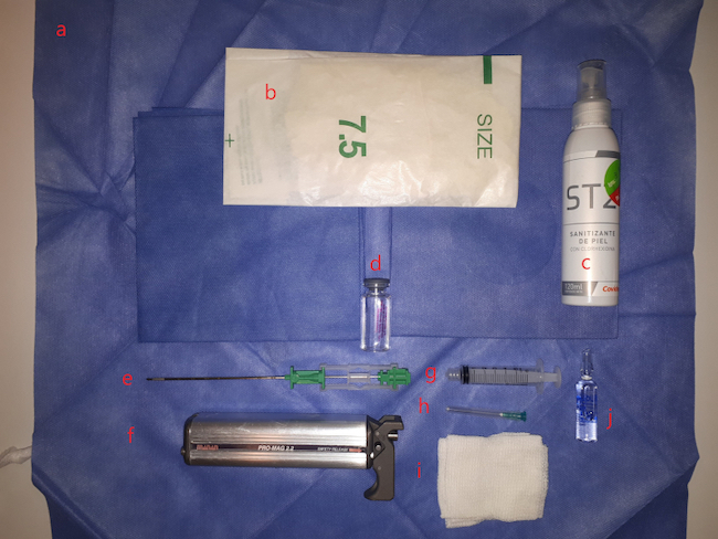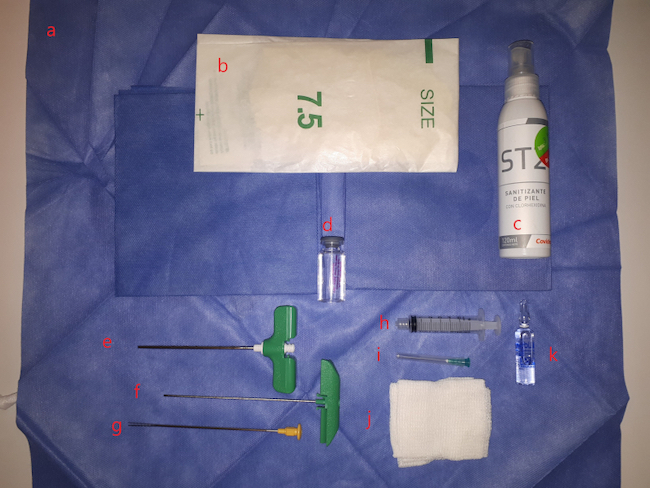 Para ambos procedimientos se utilizaron campo estéril, guantes estériles, jeringa de 5 ml tipo Terumo y aguja de 21 G para la instilación de anestésico local (lidocaína al 2%, 5 ml). Una vez adquirida la muestra, se colocó en un frasco estéril con formol al 10%. Cada frasco fue correctamente rotulado con la fecha de la biopsia y la correspondiente hoja de identificación (datos del paciente, sitio de punción, cantidad de muestras y diagnóstico presuntivo por imágenes).