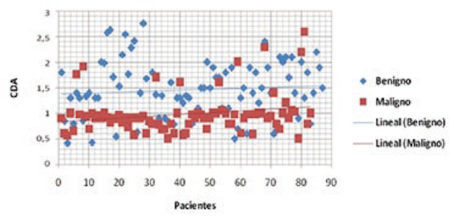 El incremento del CDA representa un aumento del espacio extracelular o una pérdida de la integridad de la membrana celular, mientras que su disminución refleja lo inverso, o bien un aumento en el número o el tamaño de las células. Esto explicaría por qué los tumores malignos tienden a tener valores bajos de CDA, y los benignos, altos. Esto fue confirmado en nuestro trabajo en coincidencia con la literatura19,22,23,24,25,26,27,28.