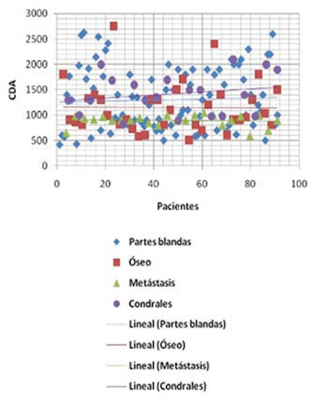 En cuanto a la división realizada en lesiones óseas primarias, de partes blandas, condrales y metástasis, las diferencias en los promedios de CDA entre los grupos fueron estadísticamente significativas (p < 0,01; F: 4,631; GL: 3; 166) (Fig. 6).