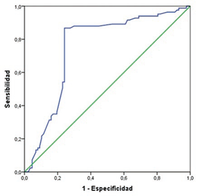 Para poder tener mayor certeza en la diferenciación entre tumores benignos y malignos se realizó una valoración del área bajo la curva, estableciendo un punto de corte óptimo de 1,083 × 10−3 mm2/s. La sensibilidad y la especificidad para la diferenciación fueron del 86,7% y el 75,9%, respectivamente (área bajo la curva: 0,789) (Fig. 7).