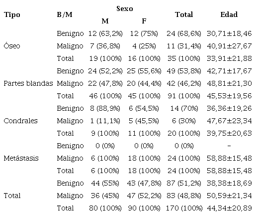 Las edades de los pacientes estuvieron comprendidas entre 2 y 83 años para los tumores benignos, con una media de 38 años (DE: ± 18 años), y entre 3 y 95 años para los tumores malignos, con una media de 50 años (DE: ± 21 años). Los pacientes con tumores malignos presentaron un promedio mayor de edad que aquellos con tumores benignos, con una diferencia estadísticamente significativa (p < 0,01; t: −3,973; GL: 168).