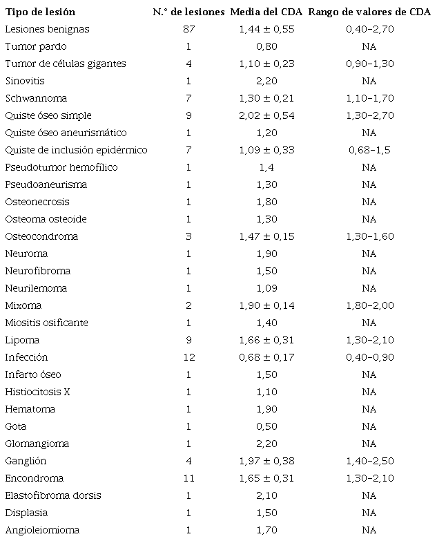 Para el análisis estadístico se agruparon las lesiones en tumores benignos y malignos, con subdivisión en tumores óseos primarios, tumores de partes blandas, tumores con matriz condroide y metástasis. Se propuso un valor mínimo de corte de CDA de 1,1 × 10−3 mm2/s para diferenciar entre lesiones benignas y malignas16.