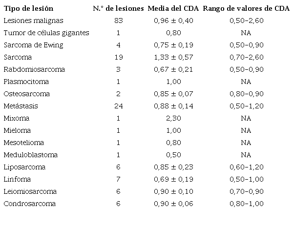 Con respecto al grupo de los tumores malignos, seis fueron de estirpe condral, con una media de CDA de 0,90 (DE: ± 0,06) × 10−3 mm2/s; 24 pacientes presentaron metástasis, con una media de CDA de 0,88 (DE: ± 0,14) × 10−3 mm2/s (ocho en mama, cuatro en pulmón, tres en próstata, tres renales, dos gástricas, dos en ovario, una en vejiga y un melanoma); y 53 pacientes presentaron lesiones primarias (11 óseas y 42 de partes blandas), con un valor de media de CDA de 1,01 (DE: ± 0,49) × 10−3 mm2/s.