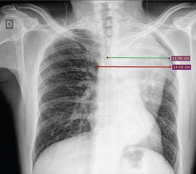 Pacientes en bipedestación, telerradiografía de tórax de frente en proyección posteroanterior, a 1,8 m de distancia tubo-película, en apnea inspiratoria, con 75 kV y 200 mA, y un tiempo de exposición aproximado de 40 décimas de segundo, ajustado al hábito constitucional del paciente. Se utilizó un equipo de rayos X General Electric Silhouette VR. En los pacientes que no podían permanecer en posición de bipedestación, se realizó en posición sentada a 90° en proyección anteroposterior, a 1,2 metros de distancia tubo-película, con un equipo de rayos X Philips MobileDiagnost WDR.