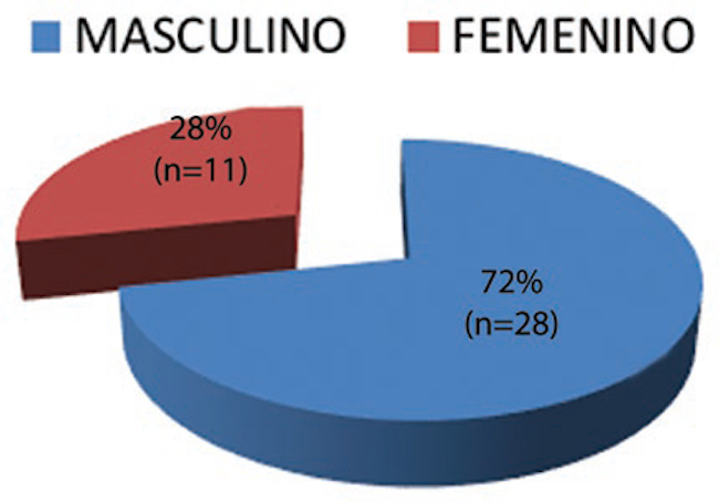 Se evaluaron 39 pacientes, el 28% mujeres (n = 11) y el 72% hombres (n = 28), con un promedio de edad de 63 años (rango: 26 a 87 años) (Fig. 4).