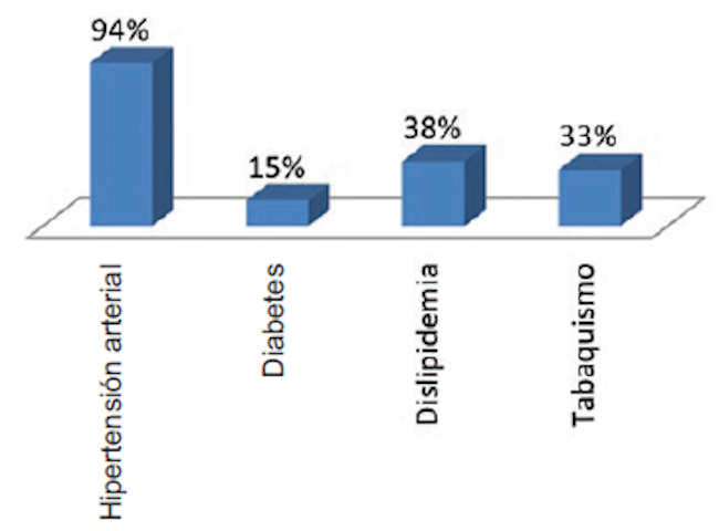 La hipertensión arterial fue el factor de riesgo cardiovascular que se presentó con mayor frecuencia en la población estudiada, en el 94% (n = 37) del total de los pacientes estudiados, seguida de la dislipidemia en el 38% (n = 15), el tabaquismo en el 33% (n = 13) y por último la diabetes en el 15% (n = 6) (Fig. 5)