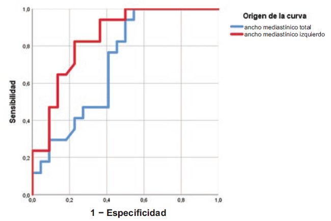 Se calculó el área bajo la curva ROC (Receiver Operating Characteristic) para el ancho mediastínico izquierdo, con un resultado de 0,84, lo que determina una buena capacidad diagnóstica del signo; hallazgo estadísticamente significativo (p < 0,001). El área bajo la curva para el ancho mediastínico máximo fue de 0,70 (Fig. 7).