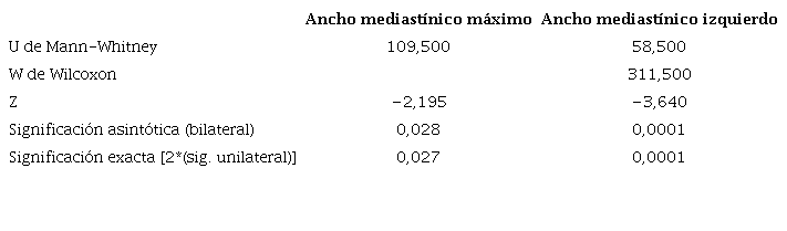 Las mediciones del aumento del ancho mediastínico máximo y del ancho mediastínico izquierdo fueron estadísticamente significativas (p = 0,027 y p = 0,0001, respectivamente, según la prueba U de Mann-Whitney) para el diagnóstico de DA (Tabla 2).