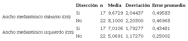 La media del ancho mediastínico máximo mostró una diferencia de 1,5 cm entre los pacientes con DA y los que no tenían DA. En cambio, la diferencia fue de 2 cm para el ancho mediastínico izquierdo.