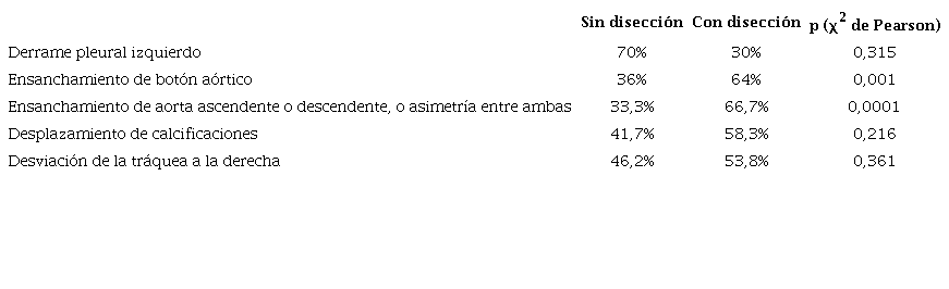 Por otro lado, el ensanchamiento del botón aórtico, así como el ensanchamiento de la aorta ascendente o descendente, o la evidencia de asimetría entre los diámetros de ambas, mostraron también ser signos estadísticamente significativos para el diagnóstico.