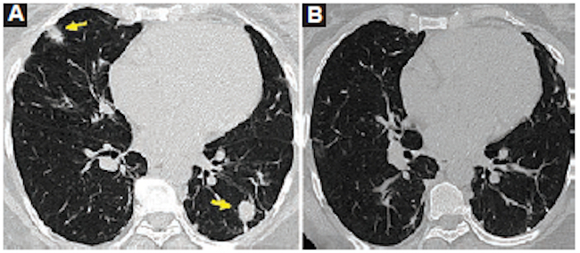 NO focal/unifocal: suele diagnosticarse durante la evaluación de un nódulo pulmonar solitario relacionado con presunta malignidad pulmonar1,5. Según Todd et al. (9, en 2015, el 18% de las NO se pueden presentar de esta forma, tienden a ser subpleurales, de densidad heterogénea, y algunas se pueden cavitar. La resección quirúrgica del nódulo suele ser el manejo definitivo para la mayoría de los pacientes, con baja tasa de recurrencia.