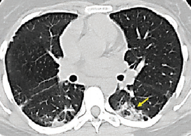 El patrón perilobular se observa en el 57% de los pacientes y se caracteriza por la presencia de bandas de consolidación curvas o en arco, de bordes mal definidos, con distribución perilinfática y subpleural (Fig. 4) (5.
