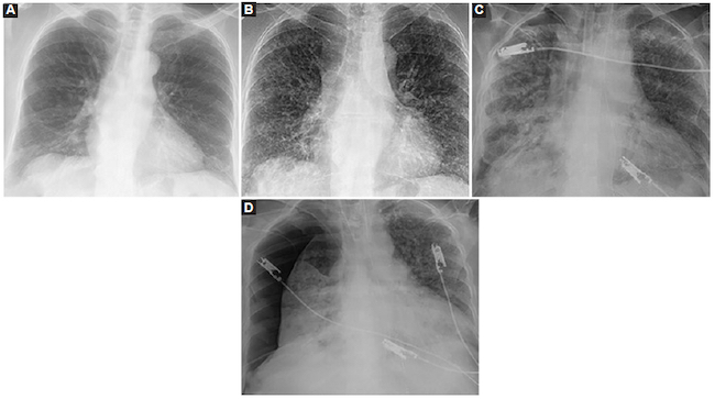 Patrones menos frecuentes son las bandas de consolidación, generalmente gruesas (más de 8 mm), que se extienden hacia la pleura, de morfología curvilínea o triangular, con o sin broncograma aéreo, y patrón en «empedrado», descrito como áreas de vidrio esmerilado adyacentes a zonas focales de consolidación y engrosamiento septal5,6. En series de casos previamente reportadas se ha descrito la presencia de linfadenopatías mediastínicas hasta en el 37,5%. Sin embargo, este hallazgo no se observó en ninguno de nuestros pacientes7.