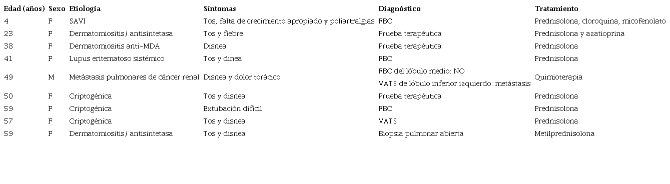 Se presentan los casos de nueve pacientes, con una mediana de edad de 49 años (rango: 30,5-58), de los que ocho eran mujeres. Tres fueron clasificados como NO criptogénica y, de los seis restantes, en cuatro se asoció a enfermedades del tejido conectivo. Tos y disnea fueron los síntomas más frecuentes, y en la mayoría (seis pacientes) el diagnóstico se realizó por histopatología. Solo se documentó una muerte, en una paciente de 59 años con dermatomiositis, síndrome antisintetasa y NO, quien desarrolló un síndrome de dificultad respiratoria aguda (SDRA), con posterior falla ventilatoria y necesidad de ventilación mecánica invasiva. Los demás pacientes presentaron mejoría clínica significativa, con resolución de la disnea en todos ellos tras el inicio de la terapia con esteroides (Tabla 1).