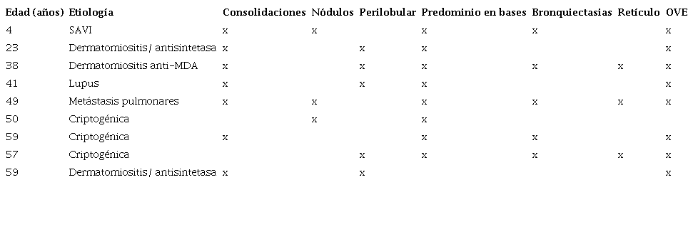Respecto a los hallazgos imagenológicos, cinco de los nueve pacientes presentaron el patrón típico de consolidaciones peribroncovasculares y subpleurales, bilaterales y asimétricas de predominio en los lóbulos inferiores, con patrón perilobular en cuatro de ellos. La presencia de nódulos se identificó en tres pacientes, y el signo del halo reverso y consolidaciones en banda solo en un paciente cada uno. Tres presentaron predominio de retículo subpleural y bronquiectasias por tracción, como signos de fibrosis (Tabla 2).