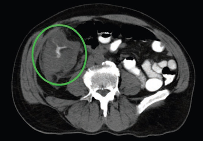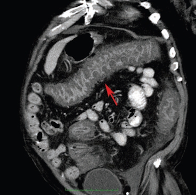 El signo del acordeón en la TC es indicativo de edema o inflamación transmural grave del colon, de cualquier etiología. Su nombre hace referencia a la similitud de las paredes edematosas engrosadas del colon con los pliegues del fuelle del instrumento musical (Fig. 1). Dicha apariencia es el resultado de la diferencia de atenuación entre los pliegues de las haustras edematosas del colon y el contraste oral atrapado entre ellas. También puede observarse debido al intenso realce, producido tras la administración de contraste intravenoso, de la mucosa hiperémica y el marcado engrosamiento hipoatenuante de los pliegues submucosos (Fig. 2) (2.