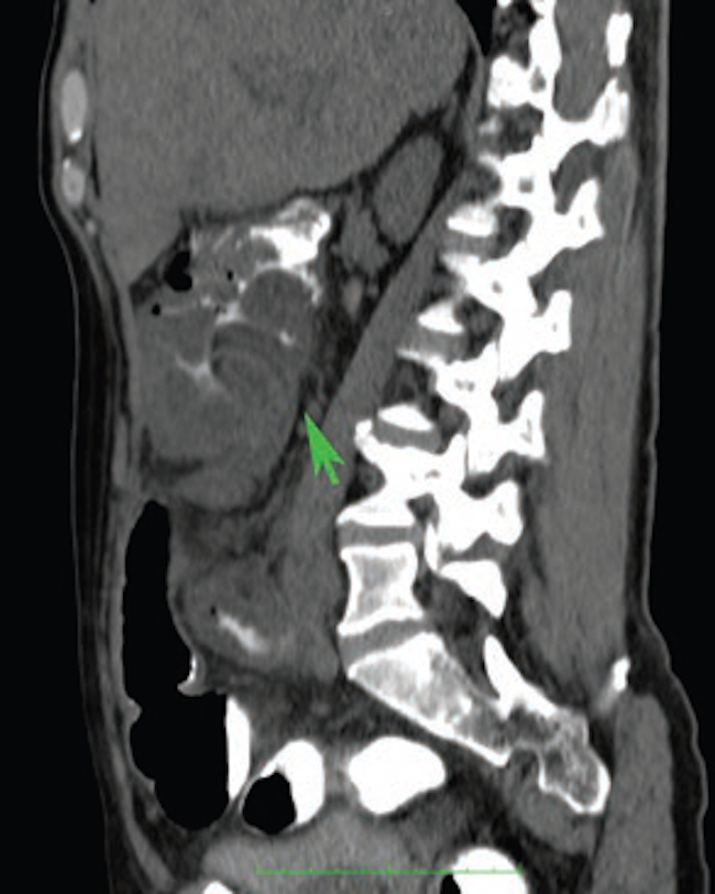El signo del acordeón es un hallazgo imagenológico que corresponde a un edema transmural colónico grave, visible por tomografía computada (TC) con o sin contraste oral. También puede observarse en radiografías de abdomen con contraste positivo1. Fue descrito inicialmente en la colitis pseudomembranosa (CPM) por Clostridium difficile, pero puede presentarse también en otras patologías, ya sea infecciosas o inflamatorias1,2,3. El signo fue reportado por primera vez en el año 1991 por Fishman et al. (4, quienes lo observaron en cinco de 26 pacientes con CPM confirmada, en estudios de TC con contraste oral, que presentaban edema parietal transmural colónico grave.