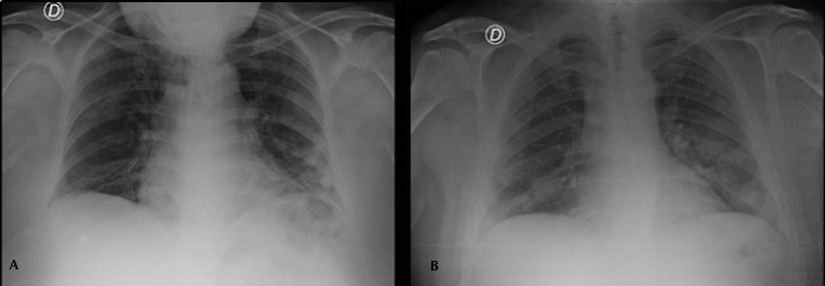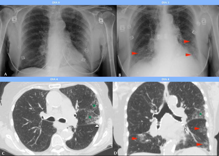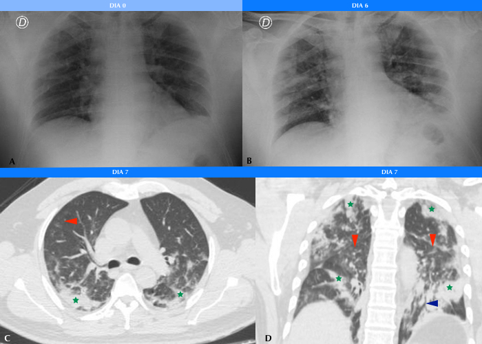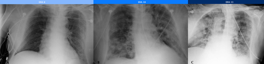 Se pudo estudiar la evolución radiológica de esta enfermedad en uno de los pacientes cuya evolución clínica fue tórpida, observándose en una radiografía inicial sutiles áreas parcheadas en vidrio esmerilado en campos pulmonares inferiores, las cuales fueron progresando hasta volverse coalescentes, difusas y consolidativas, llegando a afectar la mayor parte del parénquima pulmonar, asociándose además a derrame pleural. El paciente requirió intubación orotraqueal al décimo día de internación, sin lograr mejorar su cuadro clínico, y se constató su deceso 10 días más tarde (Fig. 2).