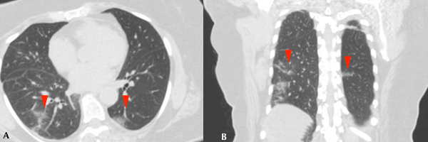 Conclusions: Our experience demonstrated the presence of patchy ground glass opacities and patchy consolidative opacities predominantly in the lower lobes as frequent features.