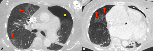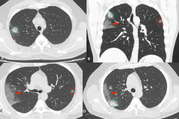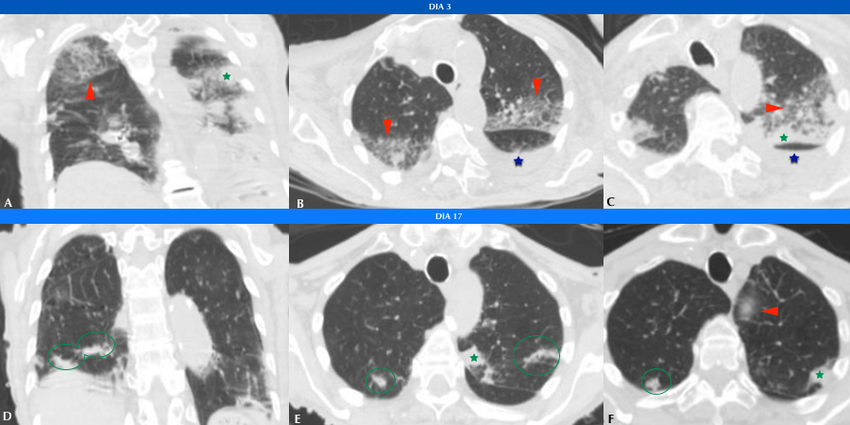 Una revisión sistemática con 919 pacientes no difiere significativamente en sus aportes12. Agrega como características poco frecuentes el engrosamiento septal, las bronquiectasias y el engrosamiento pleural, mayormente en pacientes de edad avanzada. Mencionan además como hallazgos infrecuentes el derrame pleural y pericárdico, las adenopatías mediastinales, las cavitaciones y el neumotórax.