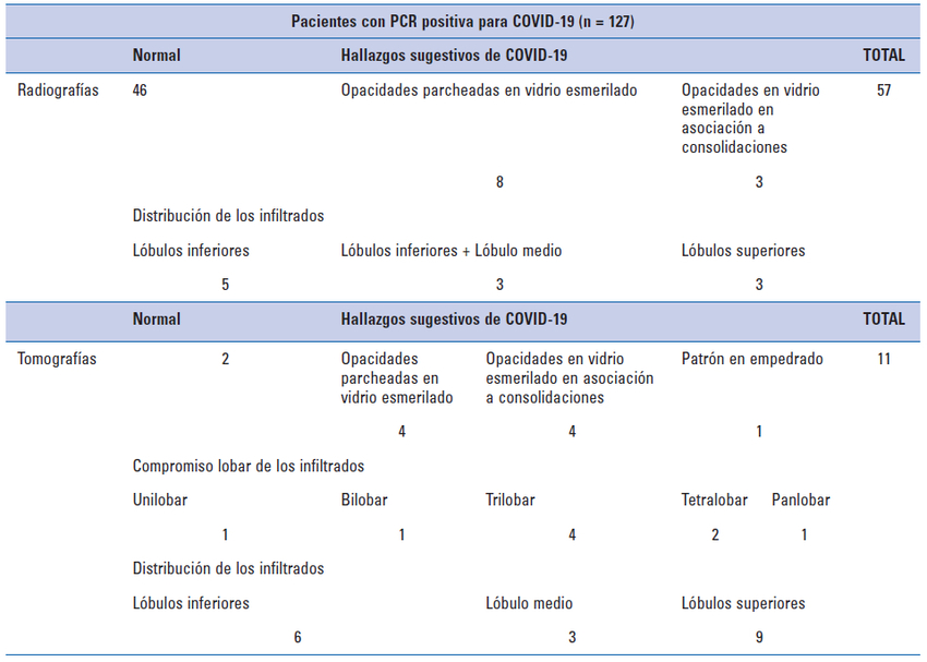 Resultados: En el período de estudio se detectaron 127 casos de COVID-19 positivos en nuestra institución. A 57 (45%) de ellos se les realizó Rx. En 46 (80%) de ellas no mostraron hallazgos patológicos. En 8 (14%) pacientes se observaron opacidades parcheadas en vidrio esmerilado y en 3 (5%) en asociación con consolidaciones. La distribución fue predominantemente bilateral y en los lóbulos inferiores. A 11 pacientes se les realizó TC de tórax y 9 (81%) manifestaron infiltrados en vidrio esmerilado, mostrando preferencia por las áreas periféricas y los lóbulos superiores, asociándose a consolidaciones en 4 (36%) casos. Un paciente (9%) presentó patrón en empedrado y otros 2 mostraron opacidades (18%) redondeadas en vidrio esmerilado. Dos pacientes (18%) no tuvieron hallazgos patológicos. Como hallazgos atípicos, se evidenció derrame pleural en 2 pacientes (18%) y neumotórax en uno (9%) en uno de ellos.