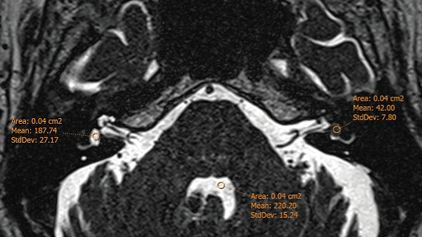 Se dibujaron áreas de interés (ROI, regions of interest) sobre la cóclea y el vestíbulo de ambos lados en las tres secuencias realizadas. Las mediciones fueron realizadas por un investigador con 6 años de experiencia en neuroimágenes (MPA). Los datos fueron estandarizados en relación con la señal del líquido cefalorraquídeo (LCR) del cuarto ventrículo para evitar variabilidad por diferencias en el fabricante del resonador (Fig. 1).
