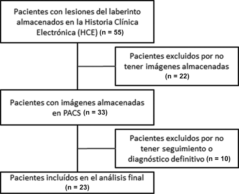 Se analizaron las imágenes de RM de 23 pacientes (Fig. 2). La mediana de edad fue de 60 años (rango: 43-73). De ellos, 13 pacientes eran de sexo masculino (M) y 10 de sexo femenino (F). Encontramos 8 pacientes (34,8%) con neurinoma intralaberíntico (4 M y 4 F), de los cuales 5 eran intracocleares y 3 vestibulococleares (3 del lado derecho, 4 del lado izquierdo y uno de bilateral); 7 pacientes (30,4%) con laberintitis inflamatoria (4 M y 3 F), de las cuales 2 eran del lado derecho, 2 del lado izquierdo y 3 eran bilaterales; 5 pacientes (21.7%) con laberintitis osificante (2 M y 3 F), de las cuales 3 eran del lado derecho, 1 del lado izquierdo y 1 bilateral; y 3 pacientes (13%) con hemorragia intralaberíntica (3 M), de las cuales 2 eran del lado derecho y 1 del lado izquierdo.